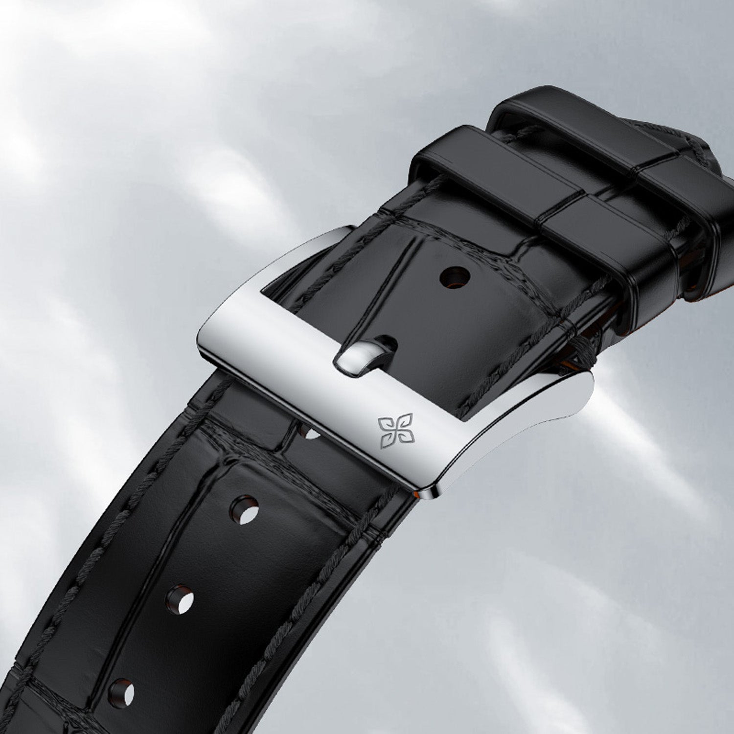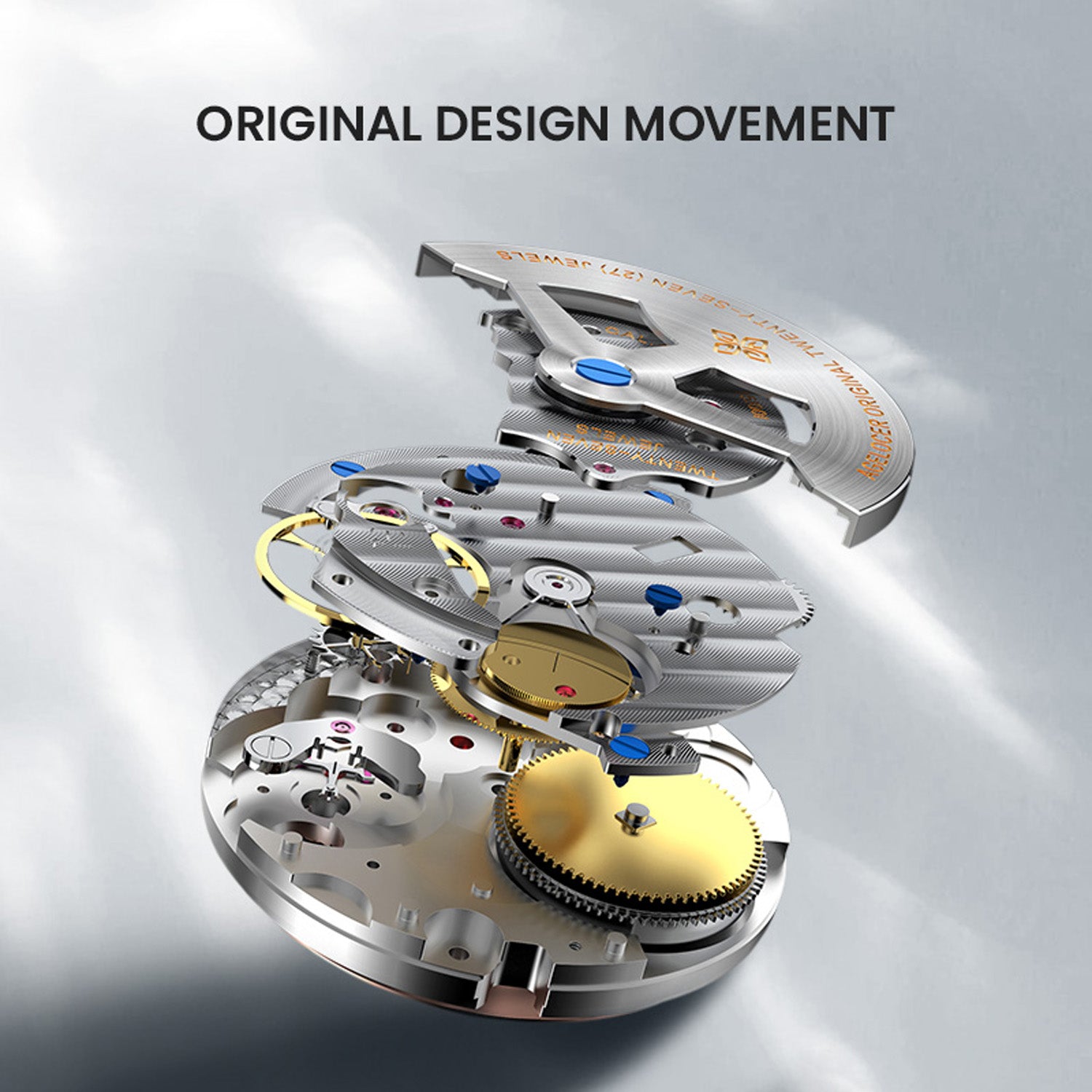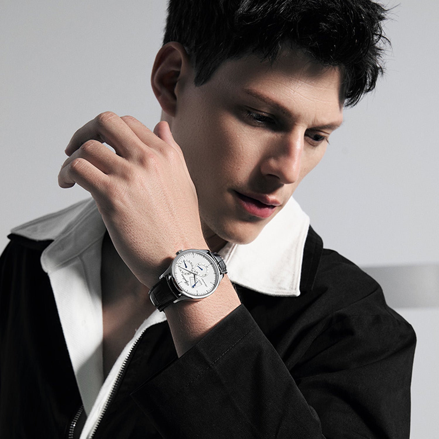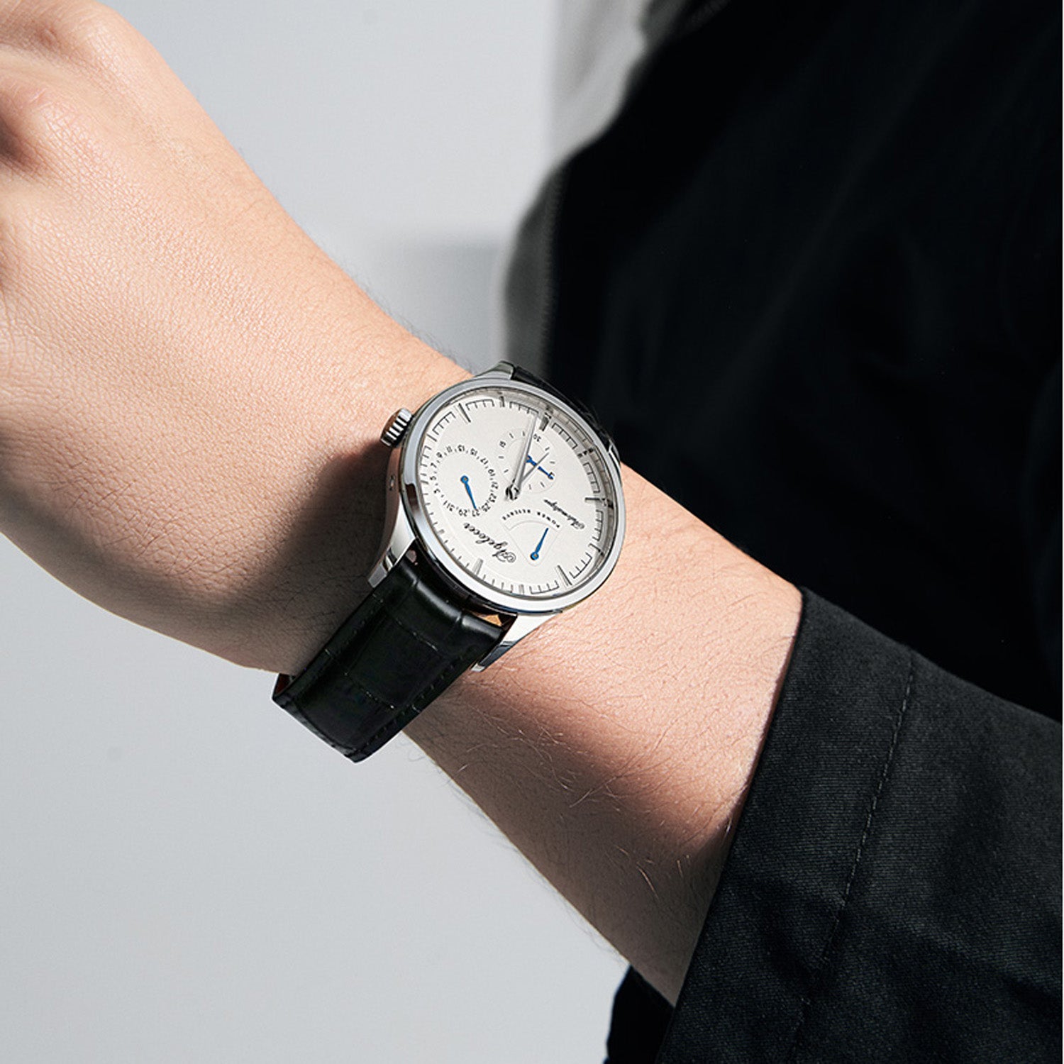 Fine polished self-developed mechanical movement, two-way winding system, 29 synthetic ruby bearings, Incabloc shock absorbers, fine Geneva pattern and sun pattern polishing, blue steel screw decoration, kinetic energy display, pointer type calendar, blue steel pointers.