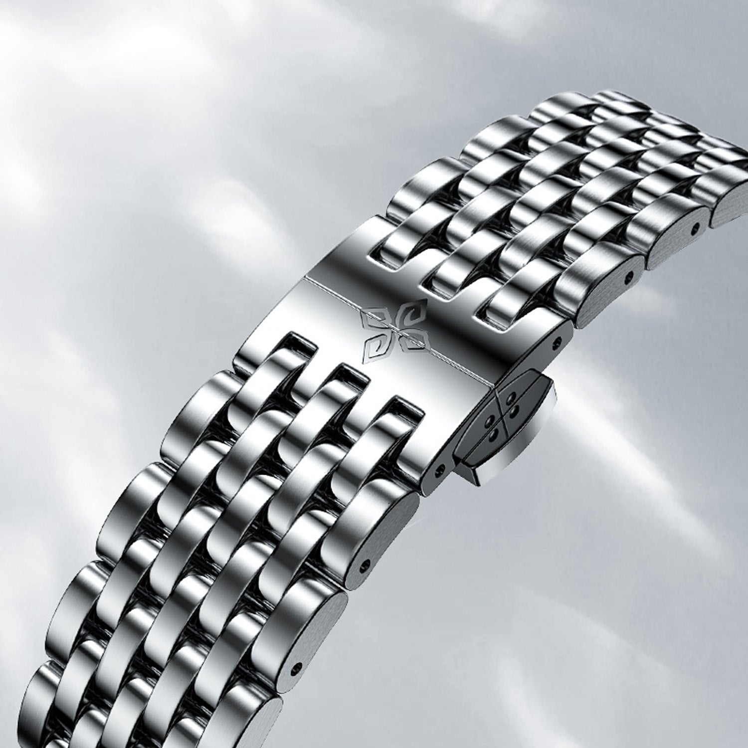 Fine polished self-developed movement, two-way winding system, Incabloc triangle suspension system, 27 synthetic ruby bearings, fine Geneva pattern polishing, gradient color dial, large window calendar, 80-hour kinetic energy, 30mm transparent panoramic back cover.