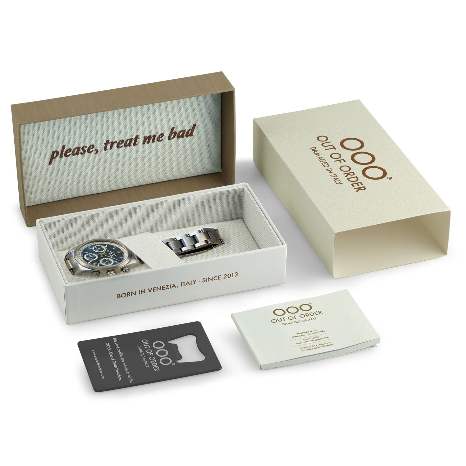 - CLASP: Deployant with safety lock and micro-adjustments with "OOO" logo on the clasp