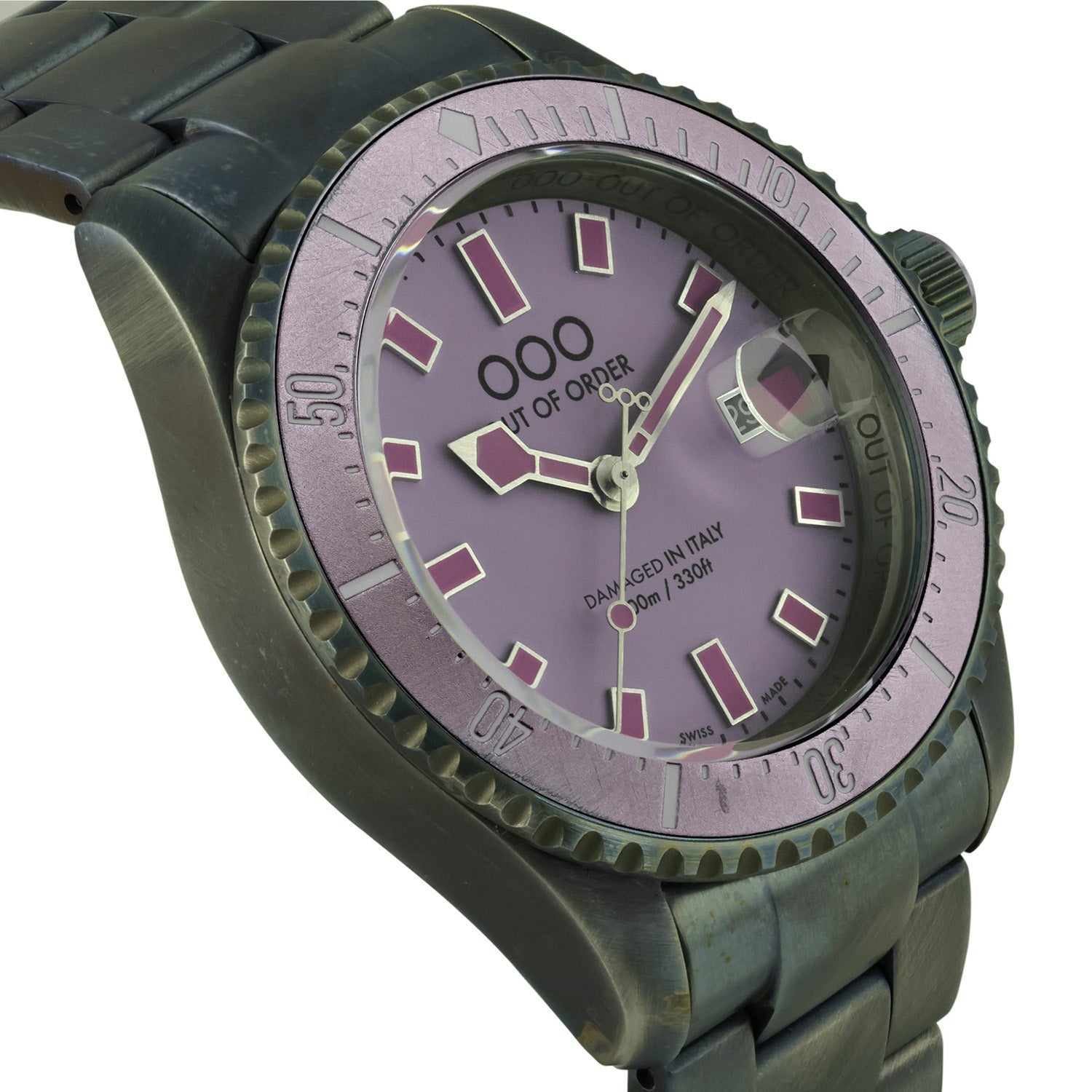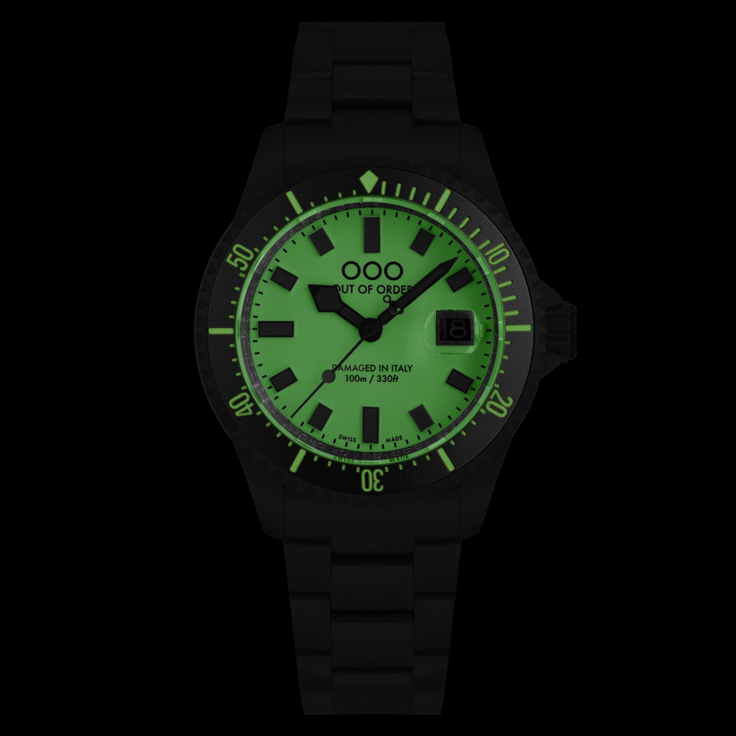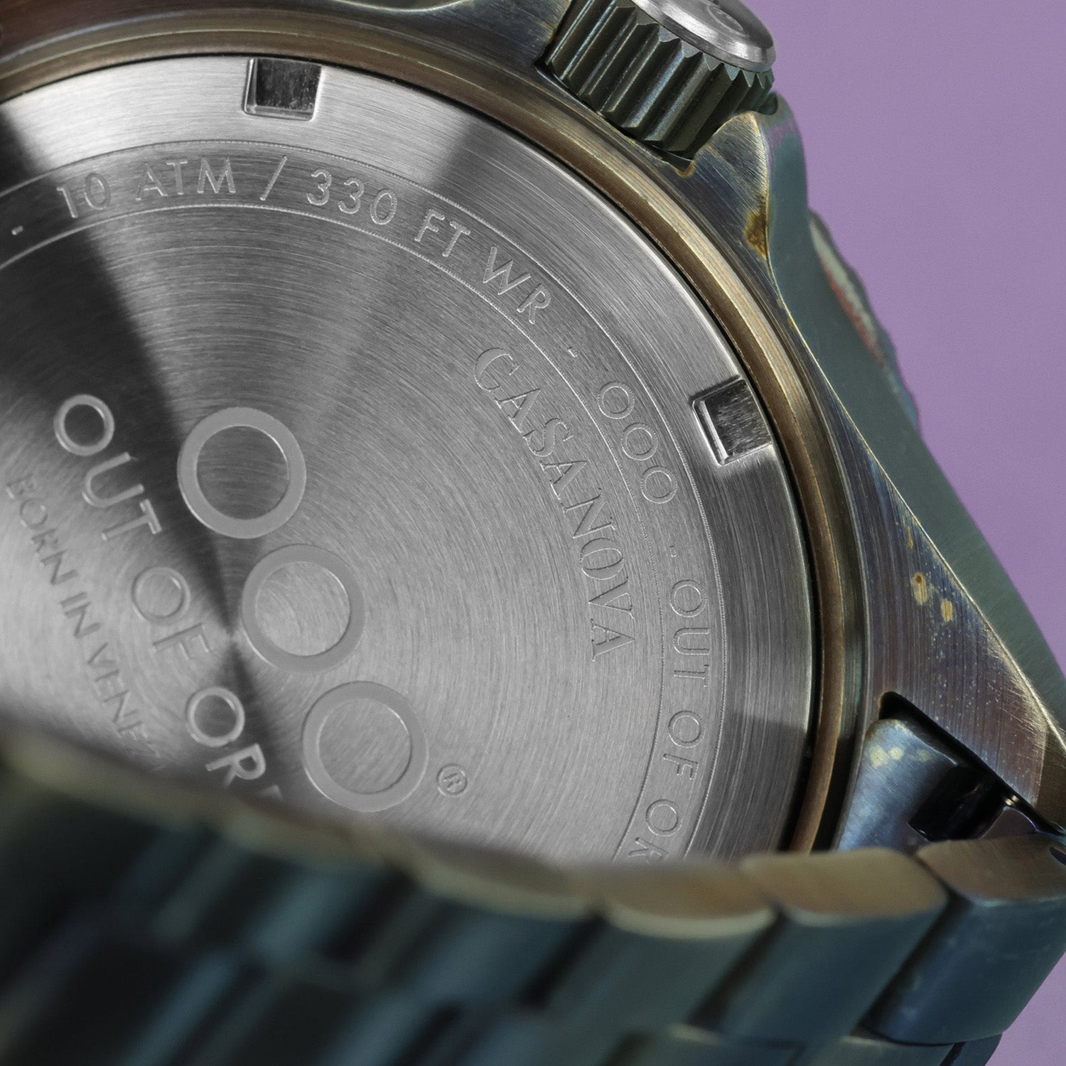 - CASE: Stainless Steel solid 316L with “OOO® exclusive aging process” with aluminum OOO® hand-brushed turning bezel, Superluminova® engraved numbers;