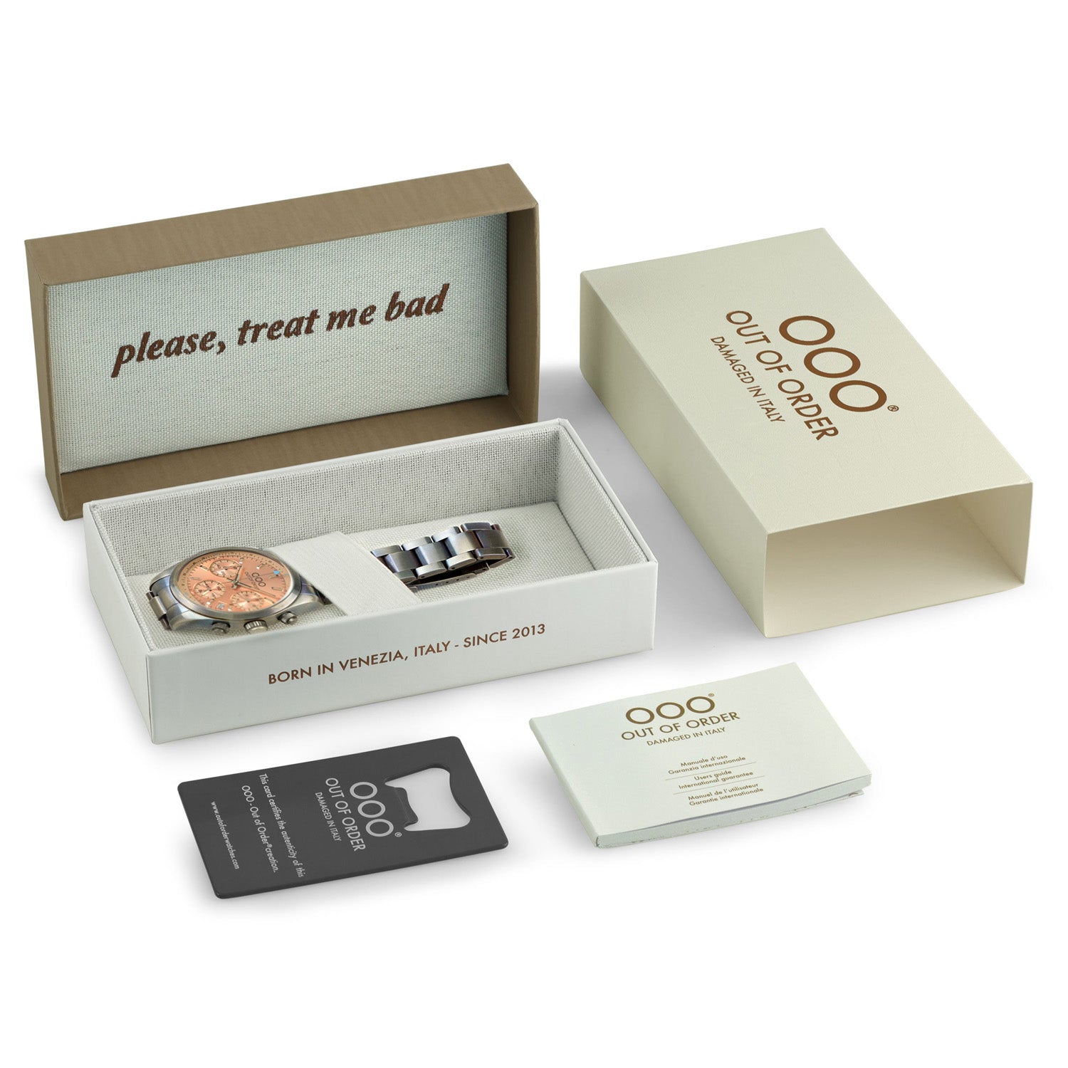 - Clasp: Deployant with safety lock and micro-adjustments with "OOO" logo on the clasp
