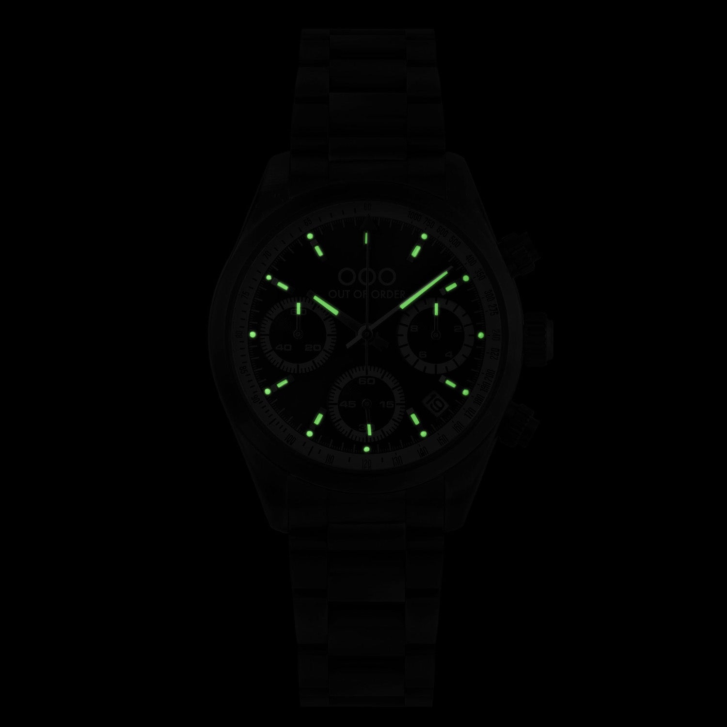 - Functions: Hours, minutes, 1/4 second, 30-minute counter, 12-hour counter, tachymeter base 1000, date