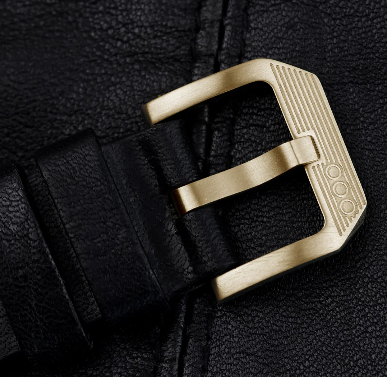 BUCKLE: marine bronze tang buckle with low-relief detailing and logo, 18 mm width