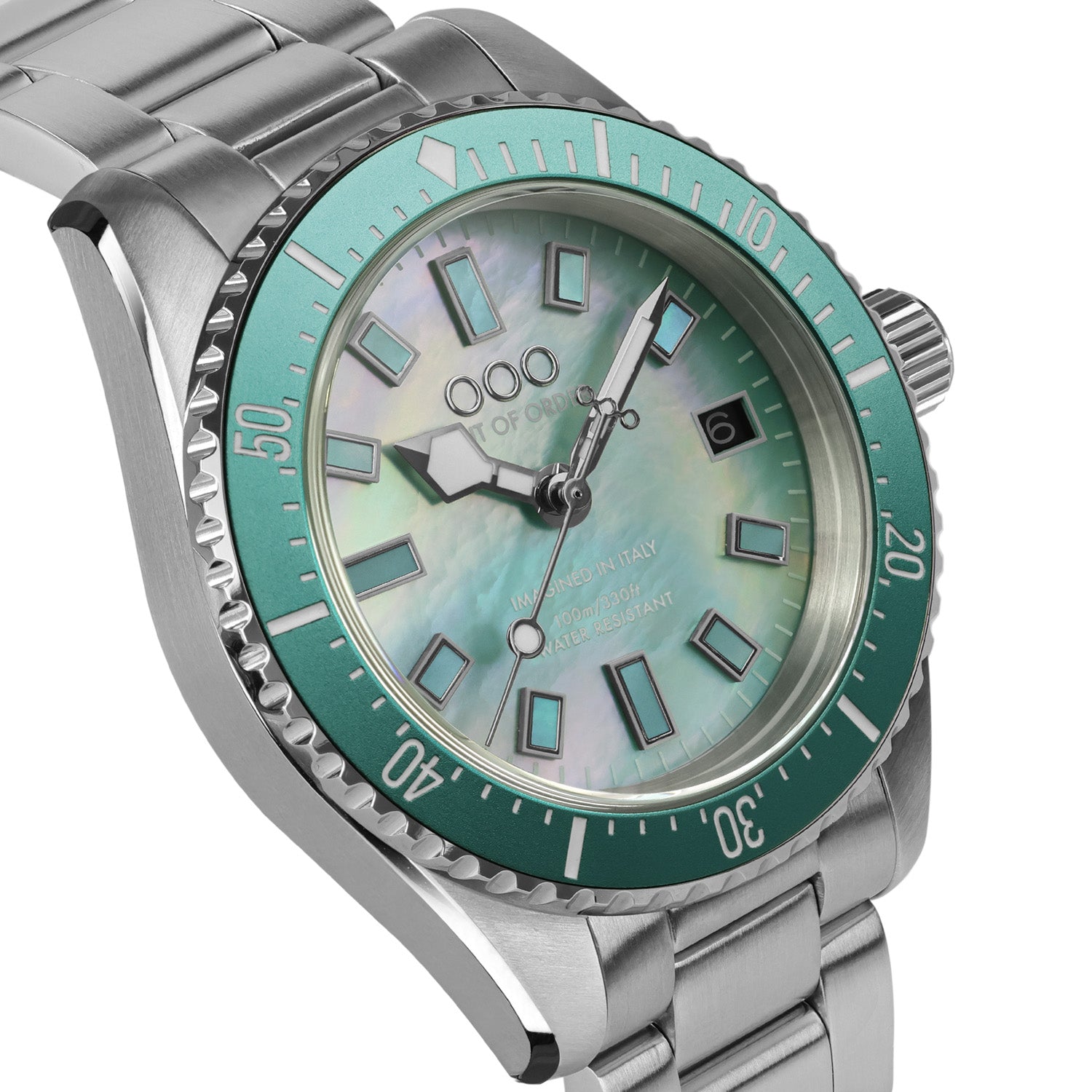 - Dial: Full Mother of Pearl dial with applied Mother of Pearl indices and Superluminova® frame, IP Silver hands with Superluminova® C3 inserts, UP applied logo