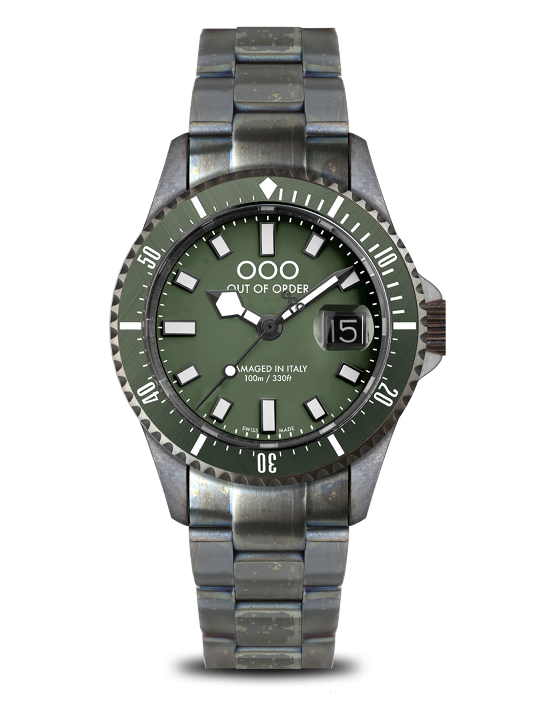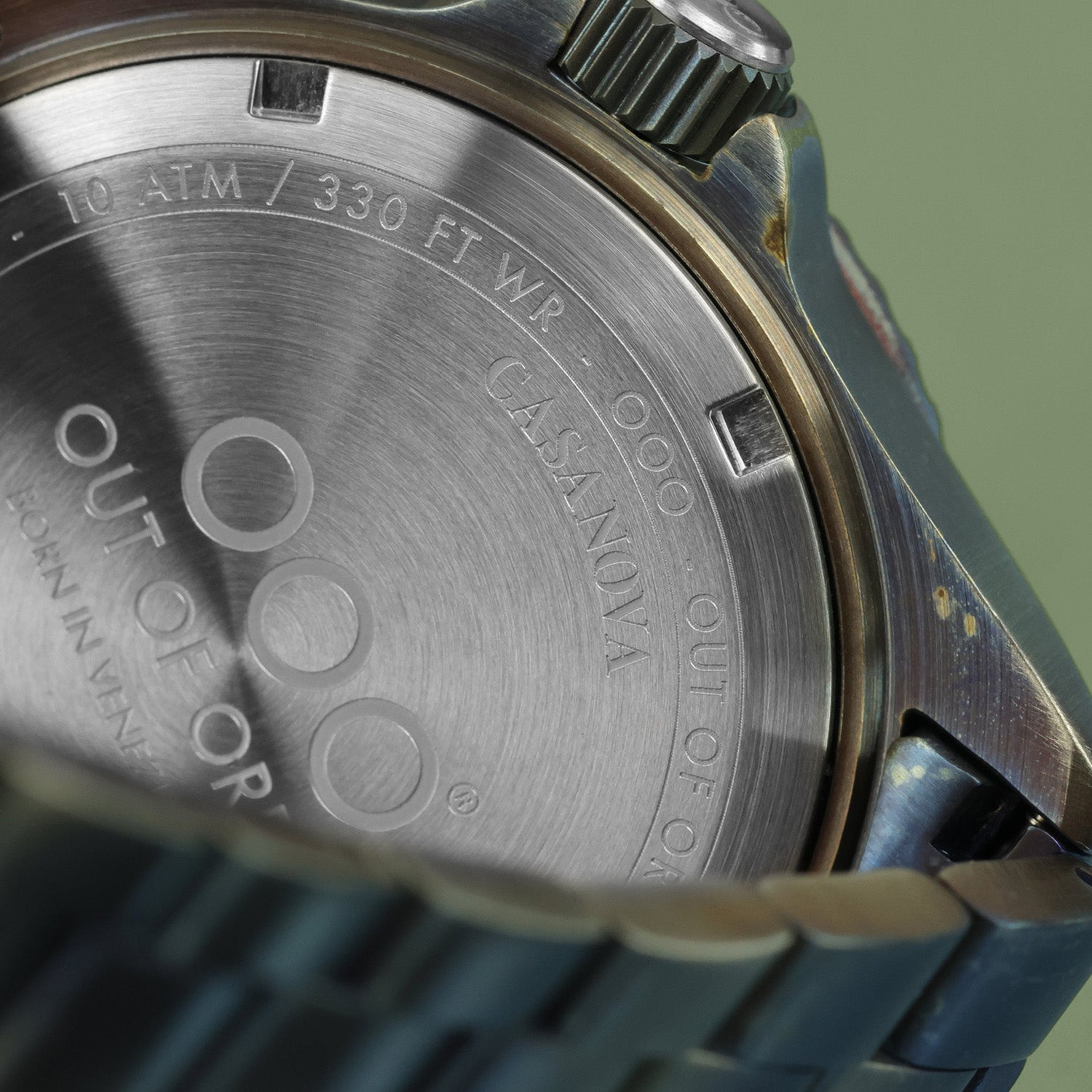 - CASE: Stainless Steel solid 316L with “OOO® exclusive aging process” with aluminum OOO® hand-brushed turning bezel, Superluminova® engraved numbers;